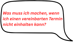 Informieren Sie uns bitte rechtzeitig! Wir müssen Sie an dieser Stelle darauf hinweisen, dass wir Ihnen nicht oder sehr kurzfristig abgesagte Termine (weniger als 24h vor dem vereinbarten Termin) in Rechnung stellen müssen! Wir bitten hierfür um Ihr Verständnis.